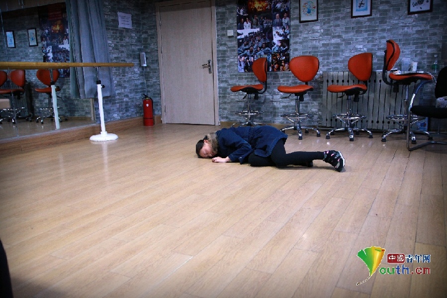 小蓉说在学习表演之前,不知道学表演这么累,像今天这样在地上滚来滚去是很正常的,经常是晚上回到宿舍一身都是脏的。(中国青年网记者孟畅摄)