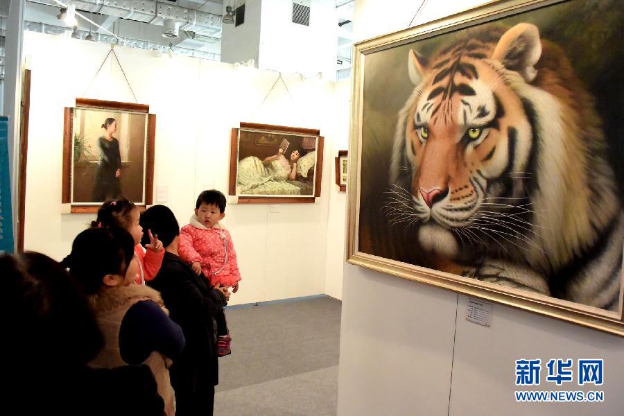 观众在山东国际艺博会上欣赏朝鲜油画作品(11月14日摄)。近日,在2014中国(山东)国际画廊艺术博览会上,来自朝鲜的30多幅油画作品亮相,细腻的绘画技巧和逼真的现实主义风格吸引不少观众。新华社记者 冯杰 摄