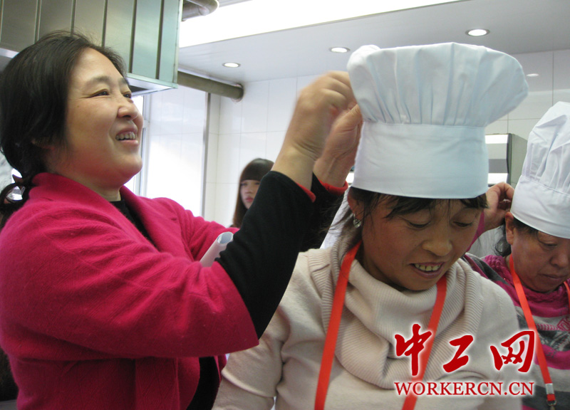 此外,高级厨师和高级服务员取证培训班也将陆续开班,为更多的女职工提供更加符合需求的免费职业技能培训。据了解,本期技能培训将为期一个半月,采取理论与实操相结合的方式,为学员讲授五十多种中式家常菜的制作方法。图为东城区工会副主席蔡艳霞为女职工带厨师帽。(中工网记者杨灵 摄)