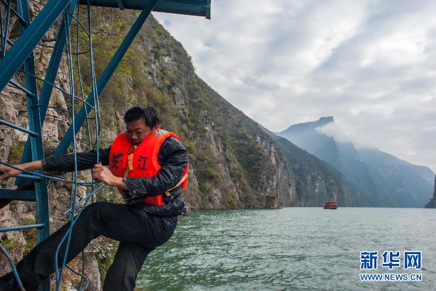 11月26日,航道工张小兵在通往“绝壁标”高空平台的悬梯上攀爬。