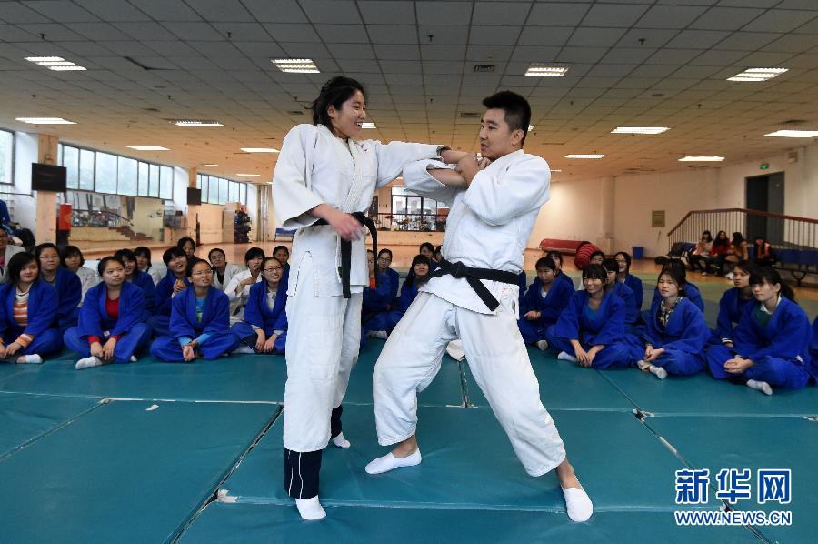 近期,郑州大学开设的女子防身术课程受到在校女生们的热捧。教授此课程的张文杰老师告诉记者,女子防身术课程将传统柔道技巧融入教学,从踢、打、摔、拿等方面增加女生防身的技术含量,帮助女生了解如何正确面对突发情况。据了解,女子防身术课程是郑州大学一门公共体育选修课,由于受到欢迎,课程也由原来的3个班增加到5个班,但仍有不少同学前来蹭课。新华社记者 李博 摄