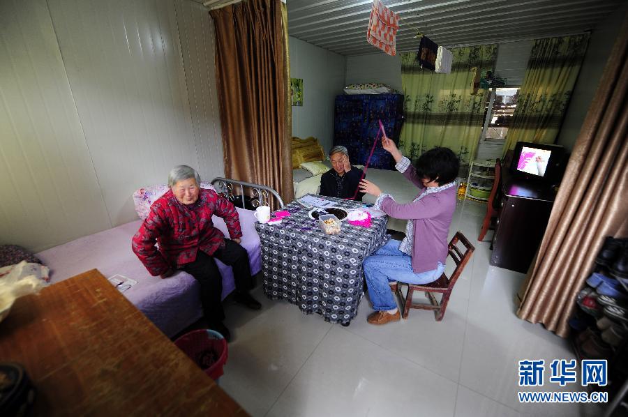王德奎夫妇与母亲在工地的简易板房内(11月30日摄)。