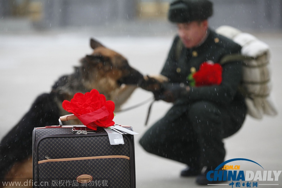2014年11月30日,地处北纬50度中俄边境线上的“黑河好八连”哨兵熊星光荣退出现役,为此,连队为熊星与“无言战友”“小龙”举行了分别和交接仪式。临别之际,熊星说他最大的愿望就是希望“小龙”平平安安、多立战功,但当他准备转身离开时,“小龙”仿佛懂得了此次别离意味着此生再难相见的道理,将前爪扑在熊星胸前,像个委屈的孩子一样紧紧地拥抱着熊星,直到熊星走出营门,“小龙”一直伴随熊星左右,沉默不语,仿佛在做最后无声的伤感告别。