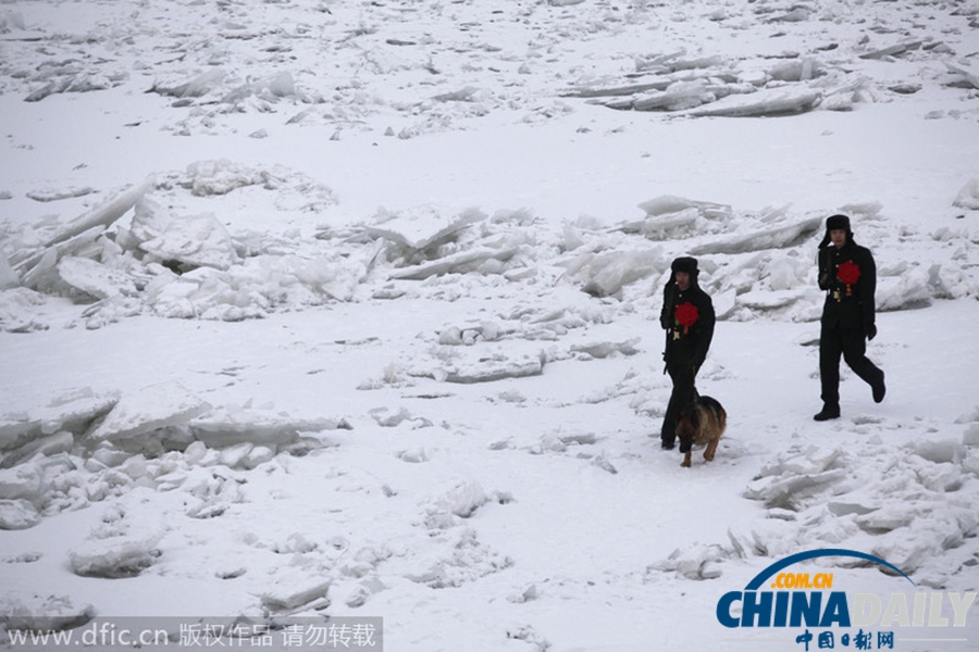 2014年11月29日,军犬“小龙”冒着随时被锋利的尖冰刺伤的危险,靠嗅觉带领战士们追踪可疑足迹。