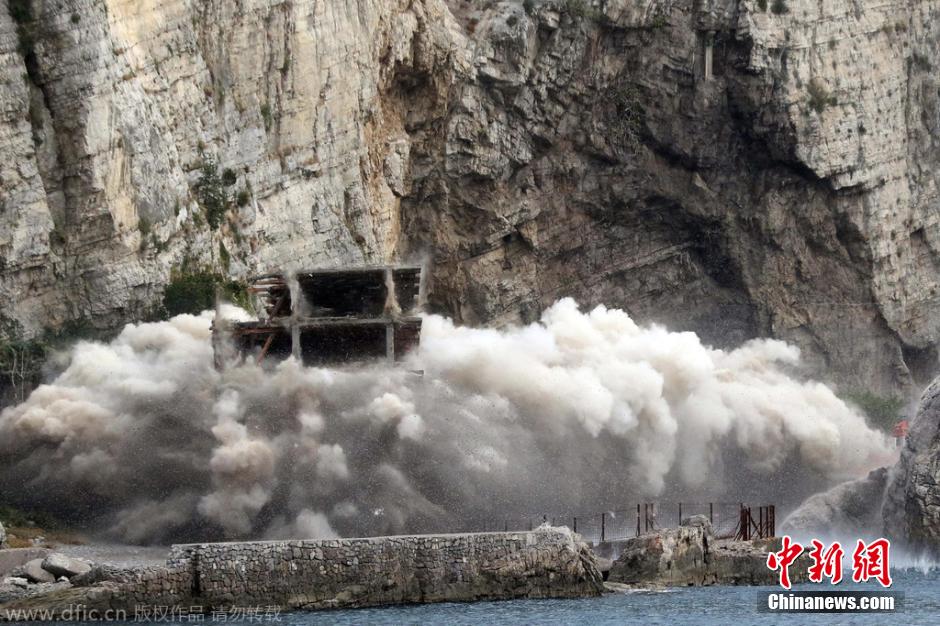 当地时间2014年11月30日,意大利索伦托沿岸,一违建酒店被爆破拆除,引起民众围观。据悉,该违章建造的酒店已有超过50年历史。图片来源:东方IC 版权作品 请勿转载