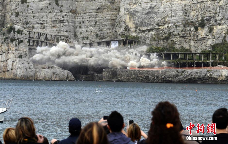 当地时间2014年11月30日,意大利索伦托沿岸,一违建酒店被爆破拆除,引起民众围观。据悉,该违章建造的酒店已有超过50年历史。图片来源:东方IC 版权作品 请勿转载