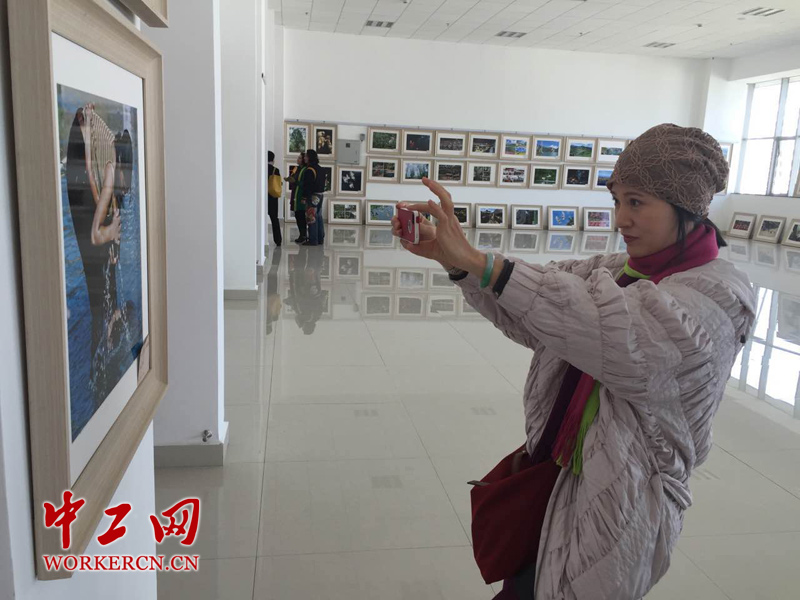 图为中国文艺志愿者协会理事、北京军区政治部战友文工团京剧团国家一级演员,梅花奖获得者于兰参观当地文化工作者摄影作品。并用手机记录下文艺工作者的作品。