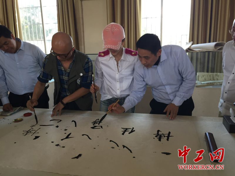 书法家封开许用刚刚制成的纸挥毫泼墨,并就笔墨纸砚与书法创作谈了他的学习体会。他说:“书法就是用毛笔书写汉字的方法和规律,简言之就是美化文字的艺术。它与音乐、舞蹈、诗歌、绘画一样,是一门纯艺术。因为中国书法是以形体各异、千变万化的中国汉字为载体,具有天然的艺术素质,加之用八面出锋的毛笔书写,通过速度、轻重、枯湿的变化,可以创造出丰富的笔墨形象,同时它还具有非常系统完整的理论体系。从而成就了中国书法艺术。”他边示范边讲解,他说,书法理论与其它文艺理论一样,既有技法理论,又有美学理论,如笔法、字法、章法,以及神、气、骨、肉、血都值得我们学习和传承。此后,他就书法的用笔、运笔还有字法结构的点画、搭配、穿插、呼应、避就,以及章法布局等进行了一一讲解和示范。并现场创作作品,引起了现场书法爱好者的热烈掌声和欢呼声。(中工网记者 宋晓俐报道)