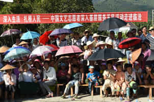 在距离节目开始还有半个小时,整体观众席就已经被闻讯赶来的群众座满,孩子们和老人都穿上了节目的盛装,期待远道而来的艺术家们为他们现场表演。中国文艺志愿者协会理事、北京军区政治部战友文工团京剧团国家一级演员,梅花奖获得者于兰表演的京剧《穆桂英挂帅》和《故乡是北京》让当地的孩子们听得如痴如醉;海政文工团女高音歌唱家何春梅在演出中和观众热情互动,一位当地阿姨激动地牵着艺术家的手久久不肯松开;舞蹈家王盛峰的一个名为《无极》的舞蹈震撼全场,孩子们安静地看着艺术家舞蹈,几乎目不转睛。