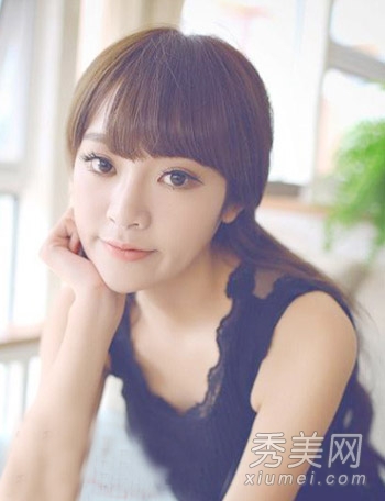 齐刘海不仅挡住了大额头还很显嫩哦,披肩长发,半扎淑女发型,柔美的平刘海微微斜分散发出甜美简约的韩式气质。