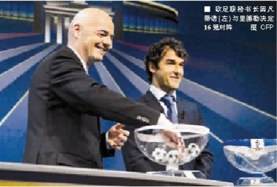 欧足联昨晚举行了欧冠16强淘汰赛对阵抽签仪式,由于本赛季欧冠决赛明年5月在柏林上演,欧足联请来柏林代表、德国宿将里德勒担任嘉宾。里德勒的手抽出了多场老友记,皇马与沙尔克、巴萨与曼城是上赛季16强淘汰赛对手。皇马上赛季9比2横扫沙尔克,沙尔克主教练迪马特奥说:“我们抽中了最强的对手,希望我们这次表现比上赛季好。”巴萨上赛季4比1淘汰曼城,如今双方又将面对面,值得一提的是曼城目前士气正旺,欧冠逆境中小组出线,英超将与切尔西的分差缩小到3分。反观巴萨,表现并不稳定,特别是他们引以为豪的进攻比起过去几个赛季,有不少退步,上轮西甲与赫塔菲互交白卷,就是一个明证。