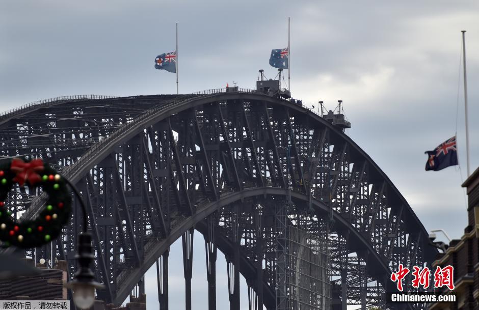 当地时间2014年12月16日,澳大利亚悉尼,悉尼多地降半旗悼念咖啡馆劫持案遇难者。