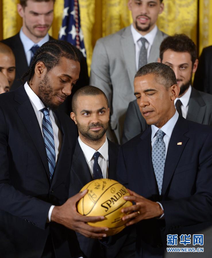 1月12日,美国总统奥巴马(前右)接过马刺队球员莱昂纳多赠送的带有签名的篮球。当日,美国总统奥巴马在华盛顿白宫接见2014年NBA总冠军圣安东尼奥马刺队教练员和球员,并接受球队赠送的球衣和篮球。新华社记者殷博古摄