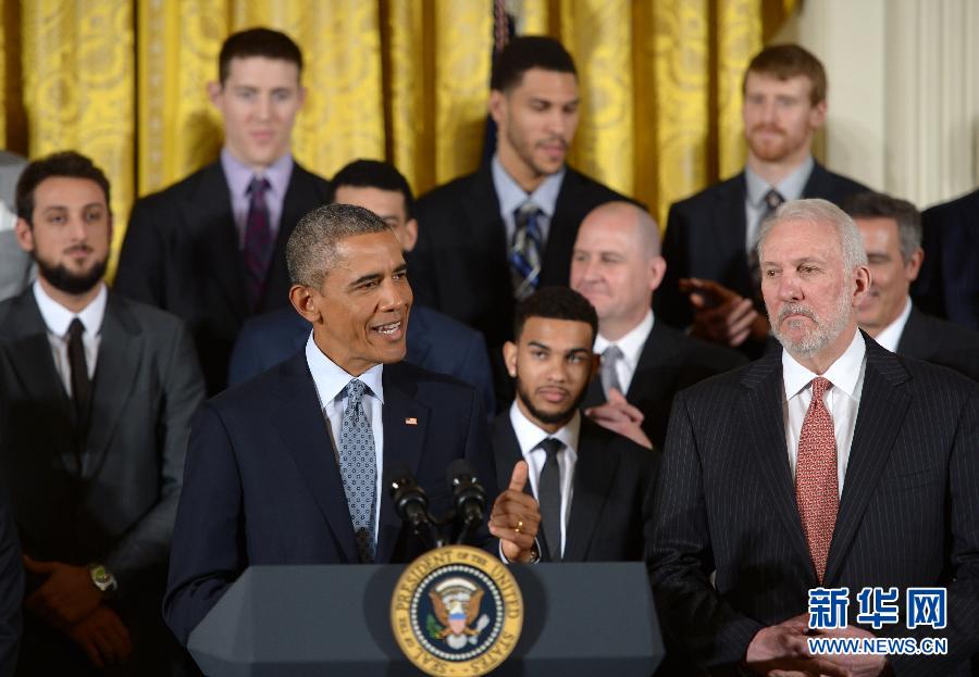 1月12日,奥巴马(左)和马刺队主教练波波维奇(右)出席仪式。当日,美国总统奥巴马在华盛顿白宫接见2014年NBA总冠军圣安东尼奥马刺队教练员和球员,并接受球队赠送的球衣和篮球。新华社记者殷博古摄