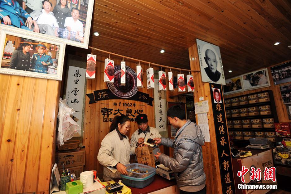 清末民初,在四川南溪出现了一种味道鲜美的地方风味食品——南溪豆腐干,距今已有一百多年历史,至此南溪便有了“中国豆腐干文化之乡”的美誉。豆腐干传统制作工艺有泡、磨、煮、滤、点、包、压、卤和烘九道工序,其中煮和卤是极为讲究的手工活。创始人郭显清为了保持豆腐干传统风味,郭显清和其子郭道福至今坚持采用手工制作,严把每一道制作关口,让每一个顾客都吃得赞不绝口。郭家作坊所创建的豆腐干传统制作工艺于2007年被列入四川省首批非物质文化遗产保护名录。图为慕名而来购买的顾客。安源 摄