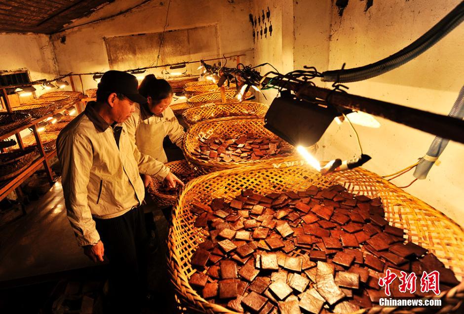 清末民初,在四川南溪出现了一种味道鲜美的地方风味食品——南溪豆腐干,距今已有一百多年历史,至此南溪便有了“中国豆腐干文化之乡”的美誉。豆腐干传统制作工艺有泡、磨、煮、滤、点、包、压、卤和烘九道工序,其中煮和卤是极为讲究的手工活。创始人郭显清为了保持豆腐干传统风味,郭显清和其子郭道福至今坚持采用手工制作,严把每一道制作关口,让每一个顾客都吃得赞不绝口。郭家作坊所创建的豆腐干传统制作工艺于2007年被列入四川省首批非物质文化遗产保护名录。图为南溪豆腐干制作工序—烘烤。安源 摄