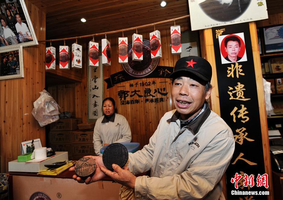 清末民初,在四川南溪出现了一种味道鲜美的地方风味食品——南溪豆腐干,距今已有一百多年历史,至此南溪便有了“中国豆腐干文化之乡”的美誉。豆腐干传统制作工艺有泡、磨、煮、滤、点、包、压、卤和烘九道工序,其中煮和卤是极为讲究的手工活。创始人郭显清为了保持豆腐干传统风味,郭显清和其子郭道福至今坚持采用手工制作,严把每一道制作关口,让每一个顾客都吃得赞不绝口。郭家作坊所创建的豆腐干传统制作工艺于2007年被列入四川省首批非物质文化遗产保护名录。图为南溪豆腐干非遗传承人郭道福展示百年印章。安源 摄