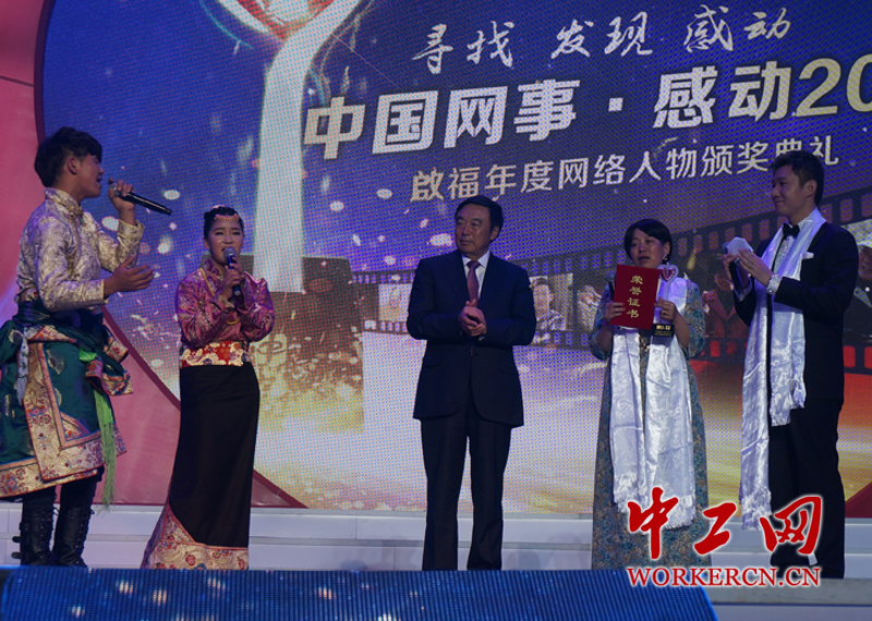 两位孩子在现场为年度人物桑吉卓玛(右二)演唱藏族歌曲《想妈妈》。雪域高原的“光明使者”桑吉卓玛:骑过牦牛,撑过渡船,踏过雪地,遇过狼群……在空气含氧量只有平原一半的雪域高原,桑吉卓玛用12年的坚守,为藏区同胞守护光明。(中工网记者杨灵 摄)