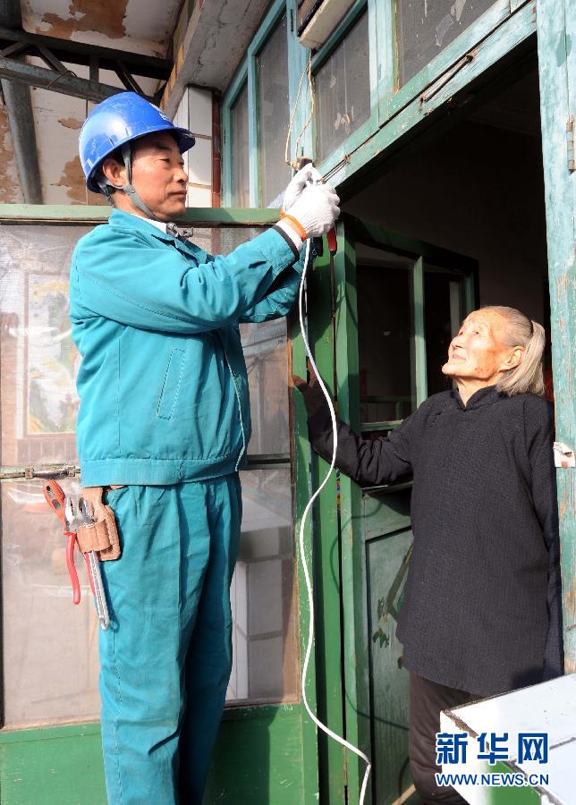 1月23日,国网文安县供电公司农电工王福胜为86岁的孤寡老人孙秀婷维修线路。王福胜是河北文安县供电公司的一名乡村农电工,负责文安县急流口管区大寺庄村的用电服务工作。工作31年来,王福胜努力钻研电工知识和实践操作,多次在省市电力系统技术比武中取得优异成绩。此外,他还义务照顾村里的7户孤寡老人,让老人们感受到灯亮、心暖、情深。新华社记者 李晓果 摄