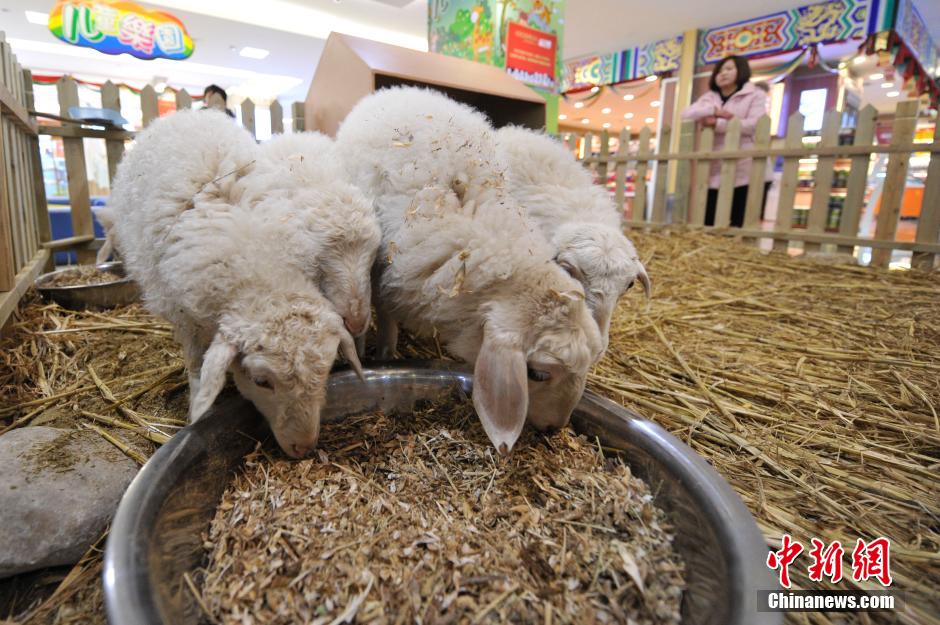 1月23日,山西太原,一家高档商场为了迎接农历羊年到来,开辟羊圈饲养了5只可爱的绵羊,吸引不少顾客围观。中新社发 韦亮 摄