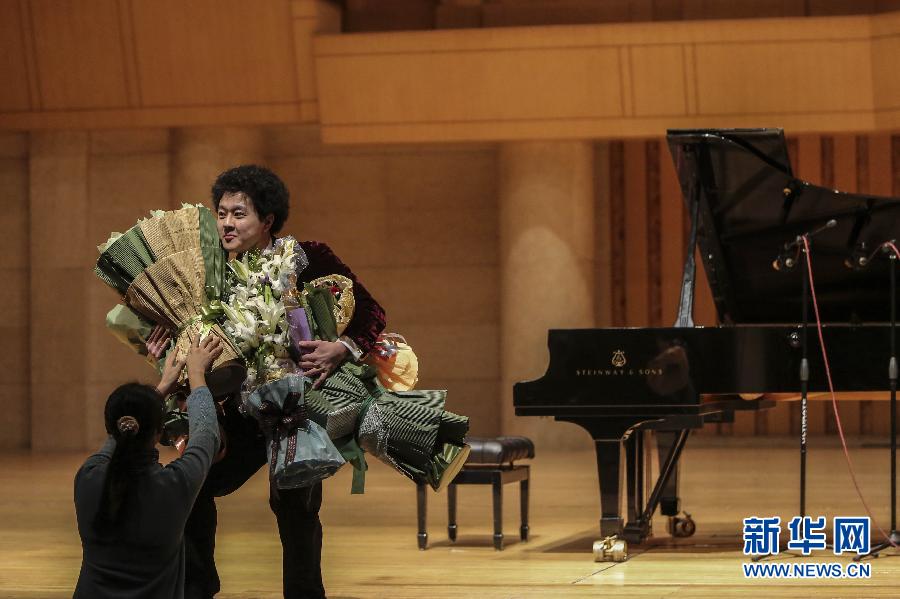 在北京中山音乐堂举行的独奏音乐会上,陈思亮接受观众献花(1月16日摄)。