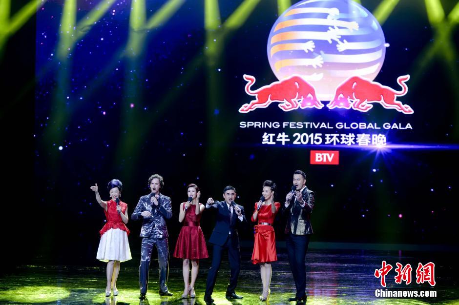 2月1日晚,《2015BTV环球春晚》在北京电视台大剧院进行了录制,来自澳大利亚、以色列、西班牙、俄罗斯等国家的驻华大使纷纷携带各国的顶级艺术家和国宝级艺术精品来到环球春晚的舞台,为中国的观众携手献上了一台精彩绝伦的艺术盛宴。图为晚会现场六位来自不同地区的主持人为晚会开场。中新社发 陆欣 摄