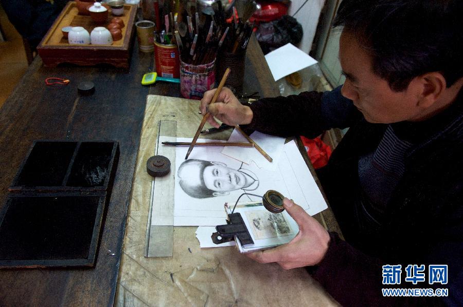 1月30日,在漳州老街延安南路142号 “松年画像”店,52岁的陈松年正在参照破损的老照片画像。