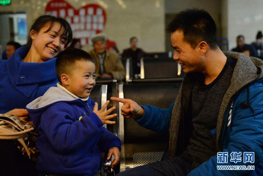 2月3日,一名小乘客在昆明火车站候车室与父亲做游戏。