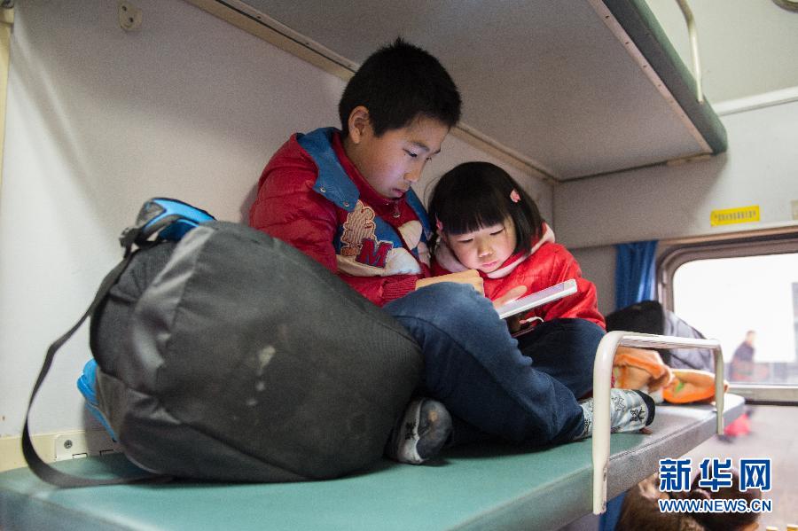 2月1日,在3216次临客列车上,12岁的田浩然(左)与妹妹黄欣然一起玩游戏,他们将返回南充。当日,上海铁路局2015年春运临客提前开行。在由上海开往成都的3216次临客上,不少小朋友跟随父母从他们打工生活的城市返回家乡。据悉,2015年春运期间,上海铁路局计划增开临客184对。新华社记者 杜宇 摄