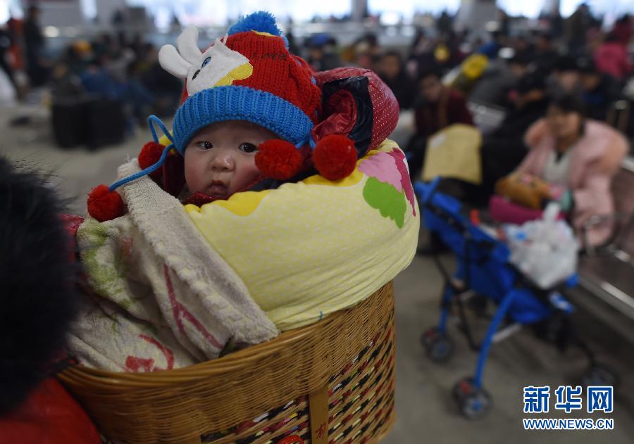 2月2日,背篓里的女婴宁宁随家人在杭州火车站候车,准备回贵州。宁宁四个月大,出生于其父母务工的浙江嘉兴。
