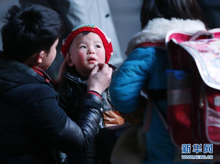 2月3日,在上海火车站外,一位家长在为孩子擦脸。春节临近,上海火车站里小朋友的身影逐渐多了起来,“小候鸟”们跟随在上海务工的父母陆续踏上归程。 新华社记者 丁汀 摄