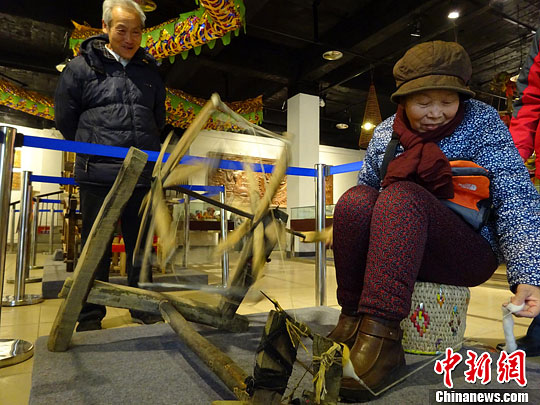 一位市民摇动纺车,追忆童年。周小云 摄