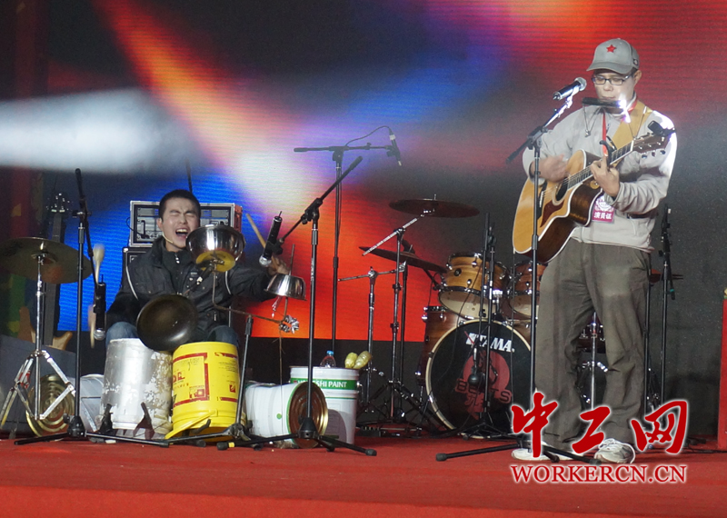 歌曲《飞翔》的表演者是桶子鼓乐队。乐队所用的“架子鼓”,是由垃圾桶、铁皮桶、油漆桶和不锈钢饭盆组成的,主唱陈汉让伴着这些特别的“乐器”,唱着自己的原创歌曲。(中工网记者杨灵 摄)