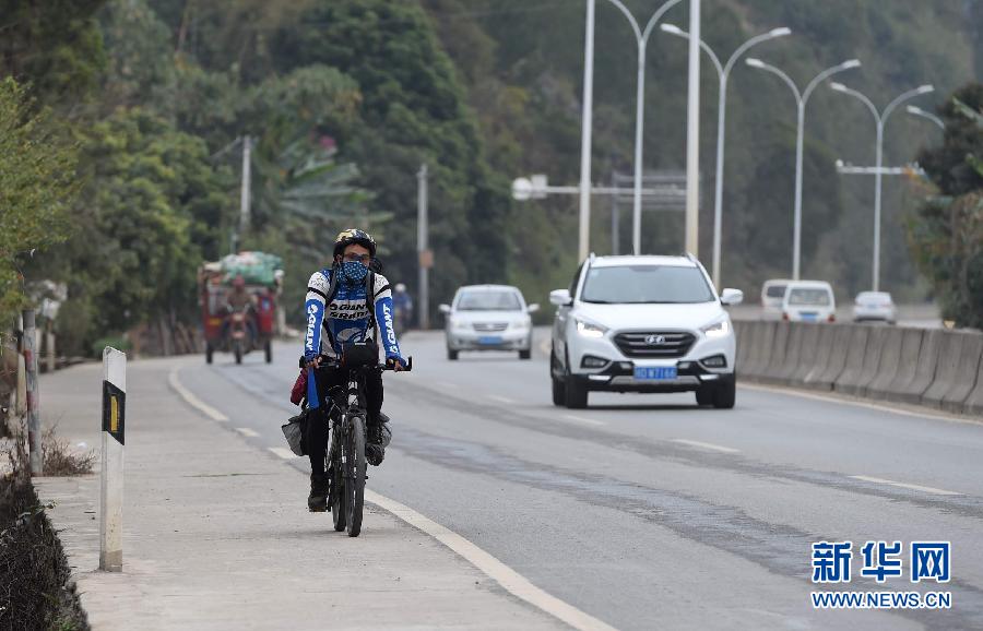 2月4日,林富荣在321国道广西梧州段骑行。 2月1日,27岁的广西平南县小伙林富荣骑上自行车,从他打工的广东省中山市启程,踏上400多公里的返乡之路。喜欢自行车运动的林富荣在中山市一家酱油厂工作,往年都是坐车返乡过年。由于今年工厂放假较早、时间充裕,便尝试骑自行车回家,计划2月5日到家。新华社记者 黄孝邦 摄
