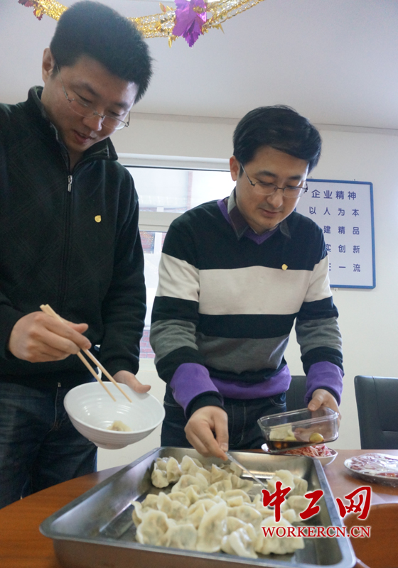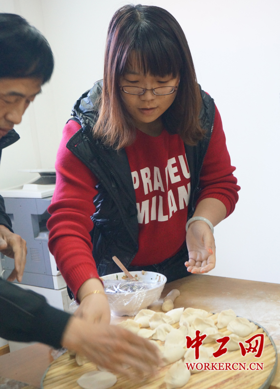 在大家的努力下,一盘盘职工自己“代言”的饺子新鲜出炉,一阵阵浓郁的饺子香,帮大家驱散了冬天的寒意,感受到了大家庭的温暖和新年的气息。(中工网记者杨灵 摄)