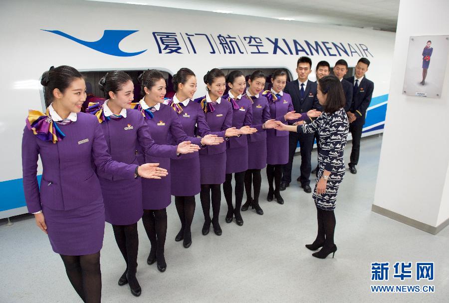 \ 2月14日,厦航B787飞机乘务员在模拟舱前练习引导手势。当日是情人节,当情侣们纷纷约会时,厦门航空有限公司培训部教室及模拟客舱内,执飞波音787梦想飞机的乘务员们却在进行实操培训。把头等舱分餐程序、迎宾礼仪等项目的各个细节逐一操练,受训的乘务员们笑称这是一份特别的情人节礼物。新华社记者姜克红