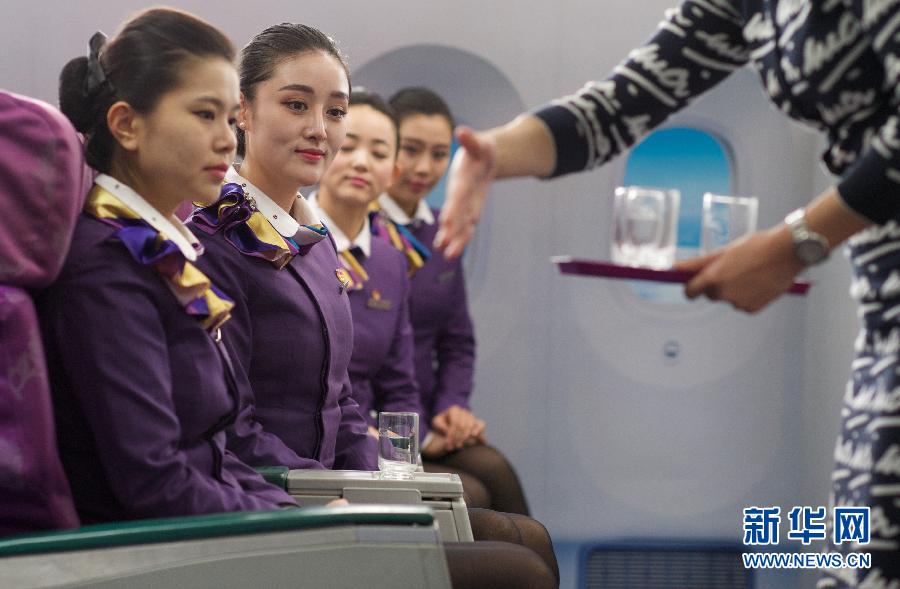 2月14日,厦航B787飞机乘务员在模拟舱内学习送饮料。当日是情人节,当情侣们纷纷约会时,厦门航空有限公司培训部教室及模拟客舱内,执飞波音787梦想飞机的乘务员们却在进行实操培训。把头等舱分餐程序、迎宾礼仪等项目的各个细节逐一操练,受训的乘务员们笑称这是一份特别的情人节礼物。新华社记者姜克红