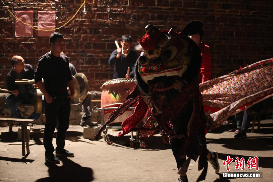 2月16日晚,广西玉林市兴业县城隍镇一村庄在抓紧训练舞狮队成员,以便在春节期间走街串巷给各家各户拜年。舞狮、舞龙等活动是广西春节期间必不可少的传统表演项目。 中新社发 王刚 摄