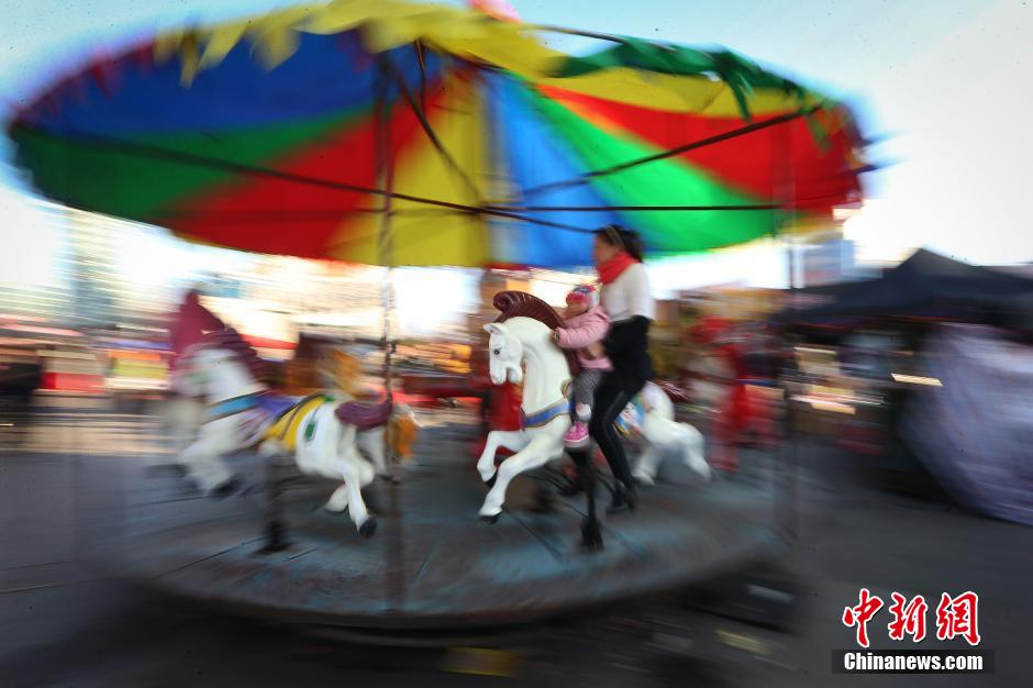 2月19日,小朋友们在江苏启东街头乘坐“旋转木马”游乐项目。羊年新春到,各地的公园景点纷纷推出各种游艺项目,吸引民众前来游玩,欢声笑语过大年。中新社发 泱波 摄