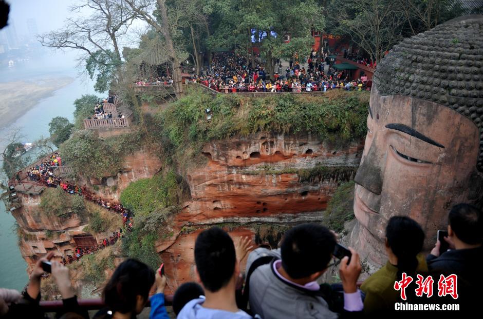 2月19日,大佛旁民众排队争先恐后一睹大佛真容。当日是农历正月初一,来自海内外各地的上万游客涌入乐山大佛景区,为一睹乐山大佛真容,大佛旁的平台以及下山栈道排起了长队,排队耗时长达1个多小时。中新社发 刘忠俊 摄