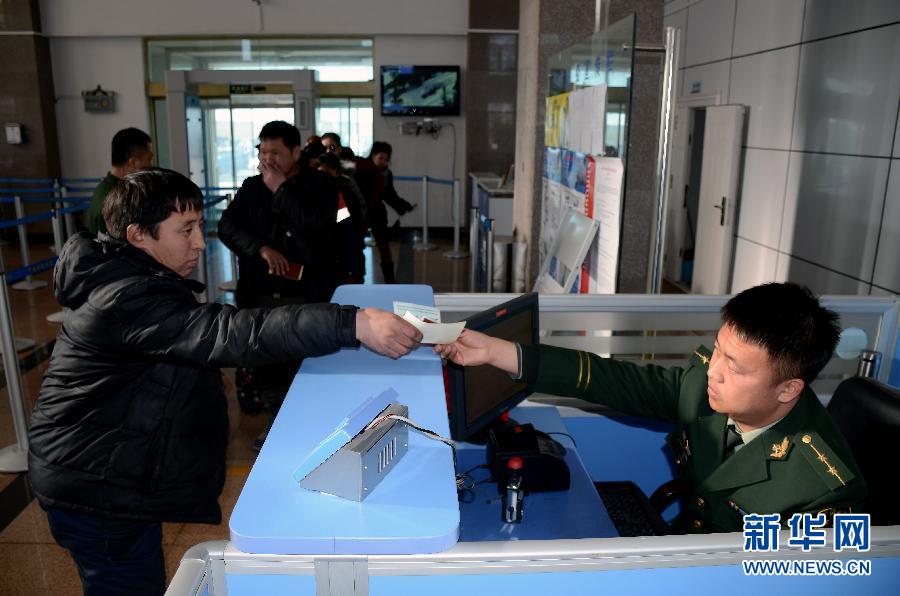 2月24日,内蒙古巴彦淖尔市乌拉特中旗甘其毛都口岸公安边防检查站官兵在对入境的蒙古国边民进行依法查验。新春佳节期间,驻守在祖国北疆各边境口岸的内蒙古自治区公安边防官兵坚守口岸国门边检勤务一线,对出入境客货运人员、车辆进行依法查验,确保口岸通关和国际贸易运输安全。新华社记者张领摄