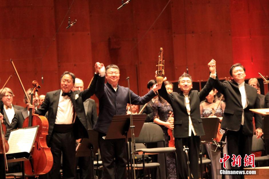 2月24日晚,纽约爱乐乐团在纽约林肯中心举行第四届中国新年音乐会,欢庆中国羊年春节。中国著名指挥家余隆再次担纲指挥,著名华裔大提琴家马友友、笙演奏家吴彤等倾情演出。图为马友友(左一)、吴彤(左三)、余隆(右)等在成功演出后向观众致意。中新社发 阮煜琳 摄