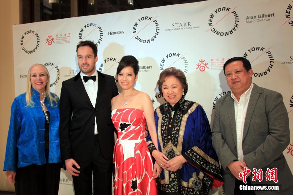 2月24日晚,纽约爱乐乐团在纽约林肯中心举行第四届中国新年音乐会,欢庆中国羊年春节。中国著名指挥家余隆再次担纲指挥,著名华裔大提琴家马友友、笙演奏家吴彤等倾情演出。图为晚会共同主席杨雪兰(右二)和陈妤(中),中央美院教授余丁(右一)等出席音乐会开幕酒会。中新社发 阮煜琳 摄