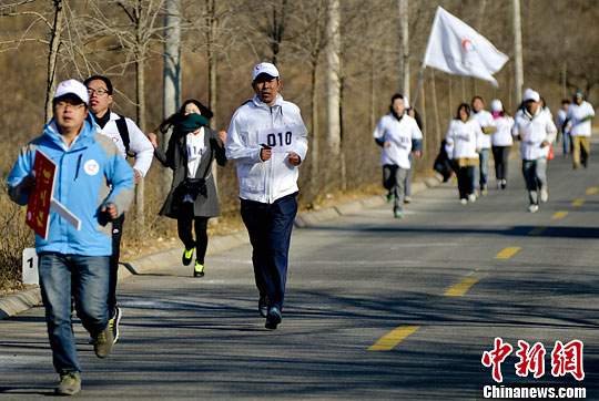 2月26日,随着清脆的发令枪声在北京延庆县慈母川村的山谷响起,四百多名志愿者用在山区公路徒步疾走5公里的形式,揭开了2015年“共铸中国心,健康起跑线”大型健康公益活动的序幕。中新社发 陆欣 摄