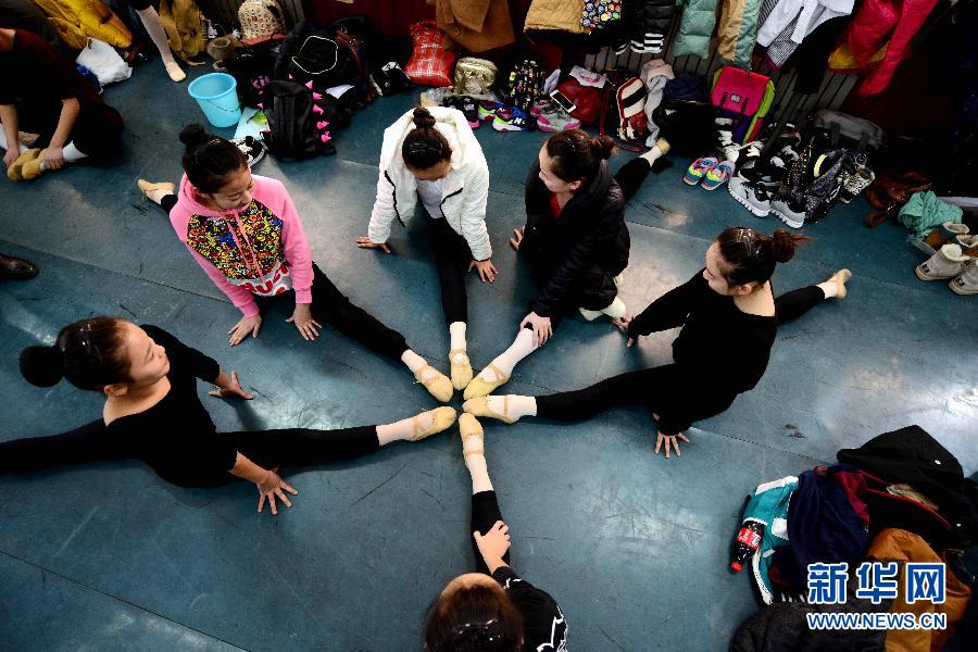 3月1日,在山东艺术学院舞蹈专业候考区,艺考生一起练功备考。