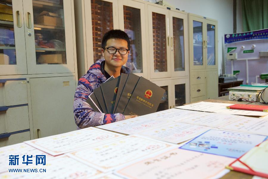 3月2日,张海龙展示所获得的7本国家专利证书和各类奖状。眼下正值一些高校大学生的毕业季,当一些毕业生为就业犯愁时,张海龙却很淡定。7项国家知识产权局颁发的发明专利、吹拉弹唱样样通、学习期间获奖无数……在大学期间的学习和付出,让张海龙收获了许多用人单位的青睐。 22岁的张海龙是江西华东交通大学电气学院的一名大四学生。他利用自己所学的专业知识,获得了“爬楼梯旅行箱”、“摩托车安全衣”、“带水情自救装置的汽车”等7项国家专利,最让张海龙记忆犹新的发明是“无盲区汽车后视镜”。他说,当时和团队为了攻克难题,大伙一起吃了数不清的方便面,晚上睡在实验室甚至有老鼠爬过自己的身体。如今这项专利已有车企欲出资收购,但是张海龙表示他和他的团队想单独进行生产和开发,自己创业。除了在专利发明方面的成绩,张海龙还是一位文艺青年:从13岁开始,张海龙每年都会参加一些曲艺演出。如今,他已是陇西县曲艺家协会的副理事长,吹笛子、拉二胡、唱秦腔样样都会。他说,音乐有助于创新和发明,是研究过程中很重要的调味剂。谈及未来,张海龙说他今后想和其他伙伴开一家创意公司,为百姓提供一些便捷、安全出行的交通产品。 新华社记者 胡晨欢摄