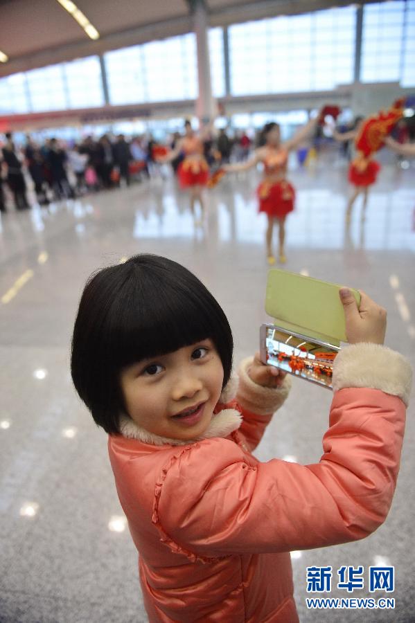3月5日,一位小旅客用手机拍摄快闪活动。当日,东方航空公司江西分公司和江西省机场集团公司在南昌昌北机场共同策划了“欢喜闹元宵”的快闪活动。来自空乘、飞行员、地勤、后勤等多个工种的工作人员拿起乐器,跳起舞蹈,还在候机室里带着孩子们包汤圆,欢乐的气氛令很多路过的旅客惊喜不已。新华社记者 周密 摄