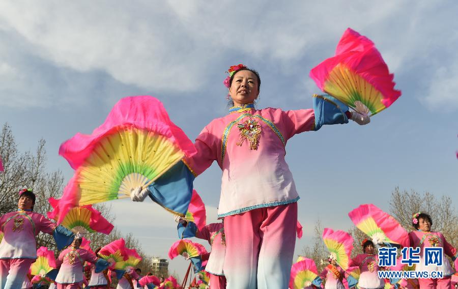 3月4日,来自山东省淄博市周村区沈家村文艺队的村民在表演秧歌。当日,山东省淄博市周村区举行庆祝元宵节传统文艺汇演,来自全区各街道30多个社区的文艺队进行了舞龙灯、耍狮子、大秧歌、划旱船等传统民俗节目表演。新华社发(董乃德 摄)