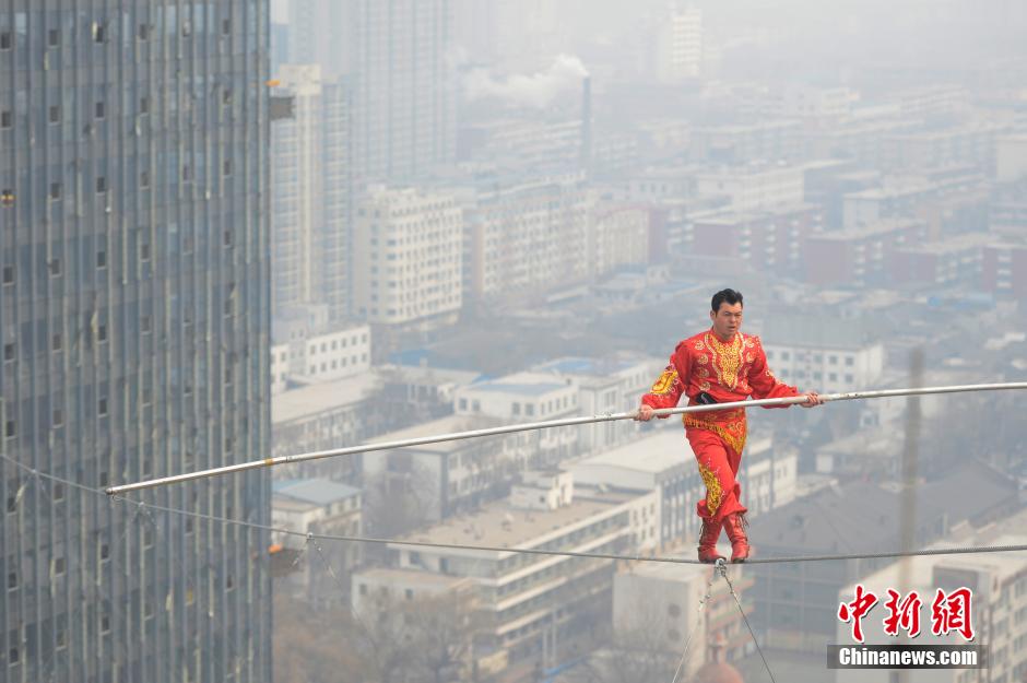 3月5日,山西太原万达中心,高空王子阿迪力家族、达瓦孜第七代传人赛买提在距离地面190米的高空上演真人钢丝秀,场面惊险刺激。韦亮 摄