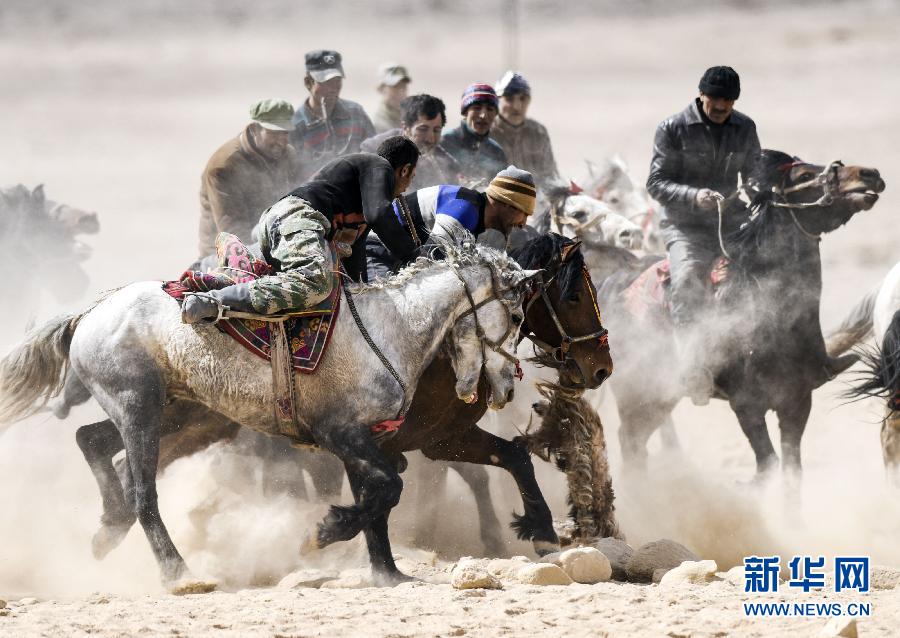 3月18日,新疆塔什库尔干塔吉克自治县提孜那甫乡的塔吉克族骑手参加叼羊大赛。当日,塔吉克族群众自发组织的叼羊大赛在新疆塔什库尔干塔吉克自治县上演。骑手们纵马奔驰在海拔4000多米的帕米尔高原上,用叼羊大赛比拼骑术,迎接春天。新华社记者 江文耀 摄